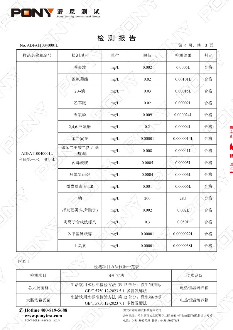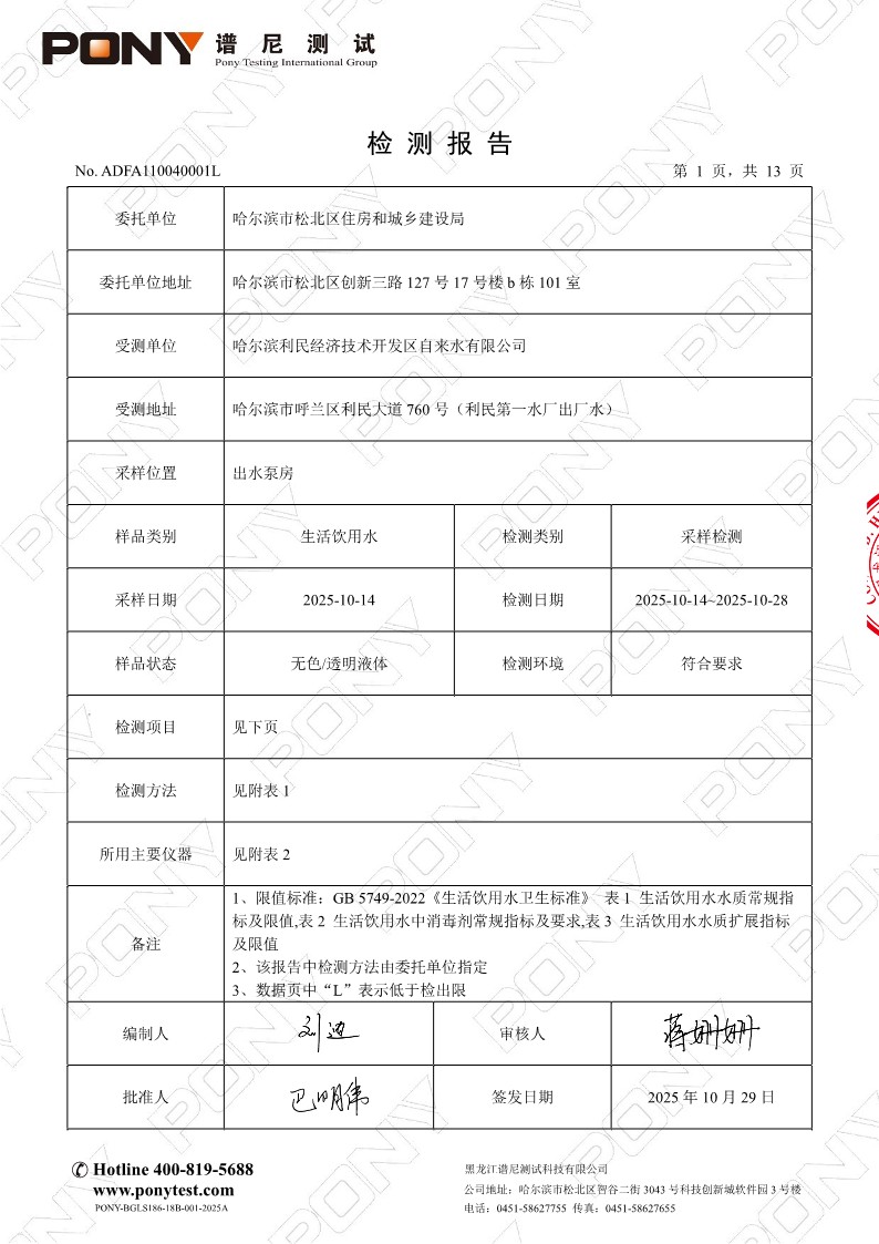 水质检测报告(利民开发区第一水厂)(报告日期2025年10月29日)